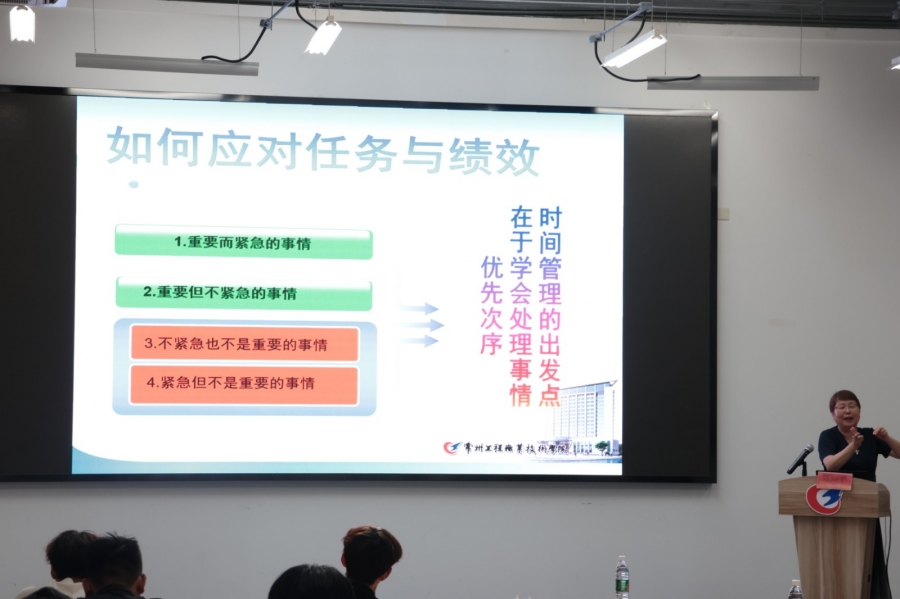 讲座中,陈向平老师从多个角度深入剖析了大学生面临的问题与成长方向。陈老师指出,在应对压力与挑战方面,要学会用阳光心态应对压力和挑战;针对任务与绩效,要学会管理时间,排出优先次序,有条理地完成任务;与人沟通的方面,要学会以仁义道德感召人,以多样的方式影响人。针对职业成长,陈老师结合“三识”(学习、实践、开放)、“三为”(目标、行为、绩效)等理念,解析了职业素养提升路径,鼓励学生树立远大目标。