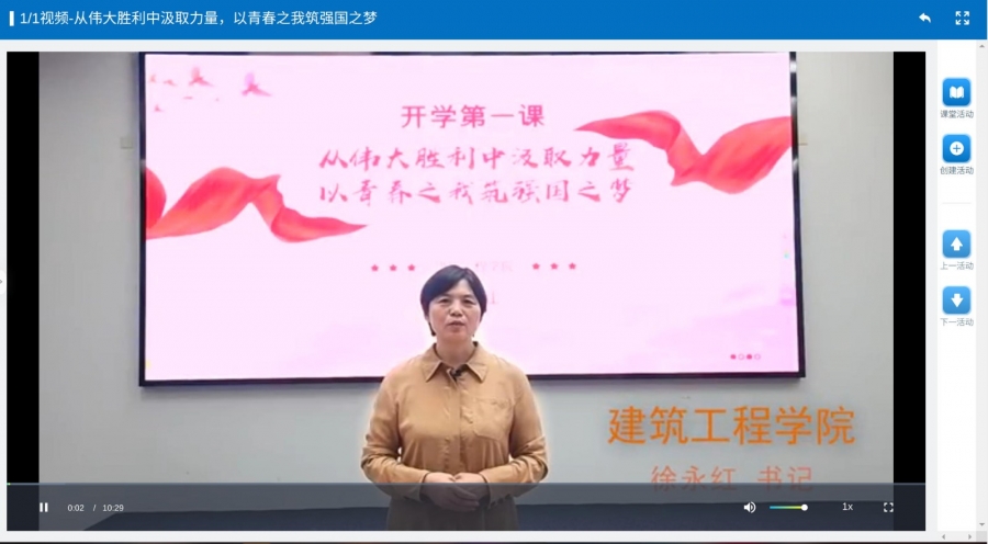 Beat365官方网站党总支书记徐永红在云课堂以视频形式讲授《从伟大胜利中汲取力量,以青春之我筑强国之梦》专题课,围绕九三阅兵展开阐释。她结合英烈事迹与受阅战旗解读抗战胜利意义,强调“铭记历史”的初心;通过受阅方阵与装备展现国家发展历程,要求学子以“精准严谨”态度对待专业实践。针对建筑行业转型,她介绍学院新增智能建造等前沿课程及产业学院共建、订单班等举措,并提出三点希望:将理想融入国家建设需求、夯实专业基础参与技能竞赛、锤炼工程人才品格,阐释“建德筑业”内涵。