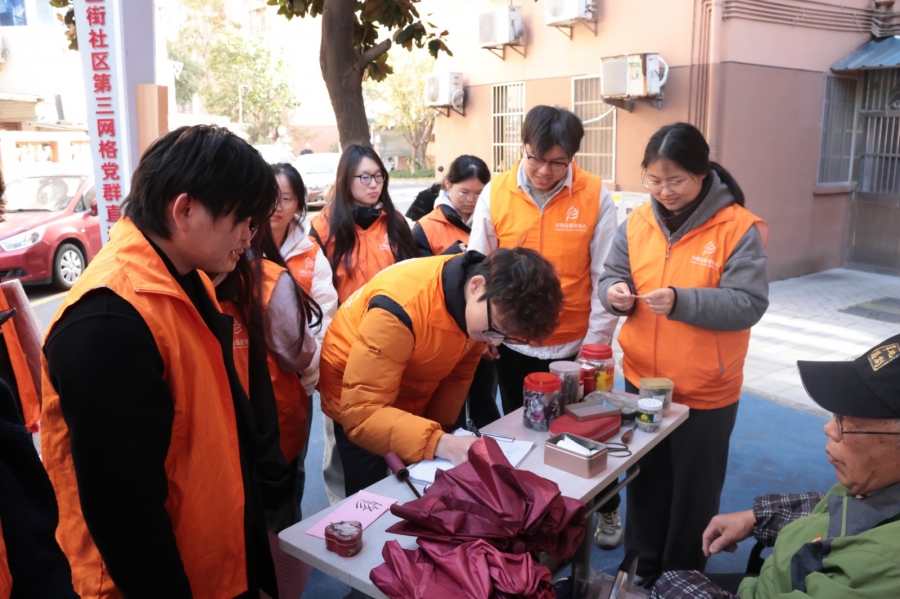 “连心亭”内,志愿者早已布置好修伞工位,螺丝刀、备用伞骨、防水棉线等工具分类摆放整齐。吴志佳先生亲自“授课”,手把手向学子演示换伞骨、缝伞面的技巧,“换伞骨要对齐卡槽才牢固,缝伞面顺着原针脚更美观”,他一边操作一边讲解,志愿者们围在一旁认真记录、反复练习,很快便掌握了基础修伞技能。