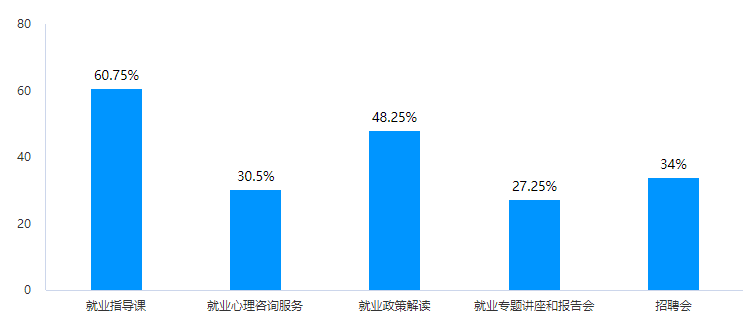 在对学校提供就业帮扶方式的调查中发现(图3),就业指导课程占比最大,达60.75%,其他方式占比由高到低分别为:学校解读就业政策(48.25%)、举办招聘会(34%)、就业心理咨询服务(30.5%)及就业辅导讲座和报告会(27.25%)。上述结果可看出,学生对学校提供的多样化就业帮扶均表现出一定的需求。面对日益复杂的就业形势和职业发展需求,高校毕业生亟需全方位、个性化的职业指导服务,但目前高校职业指导体系建设还不够健全,难以满足学生的多元化需求,高校需注重就业理论指导与实际就业技能训练相结合。